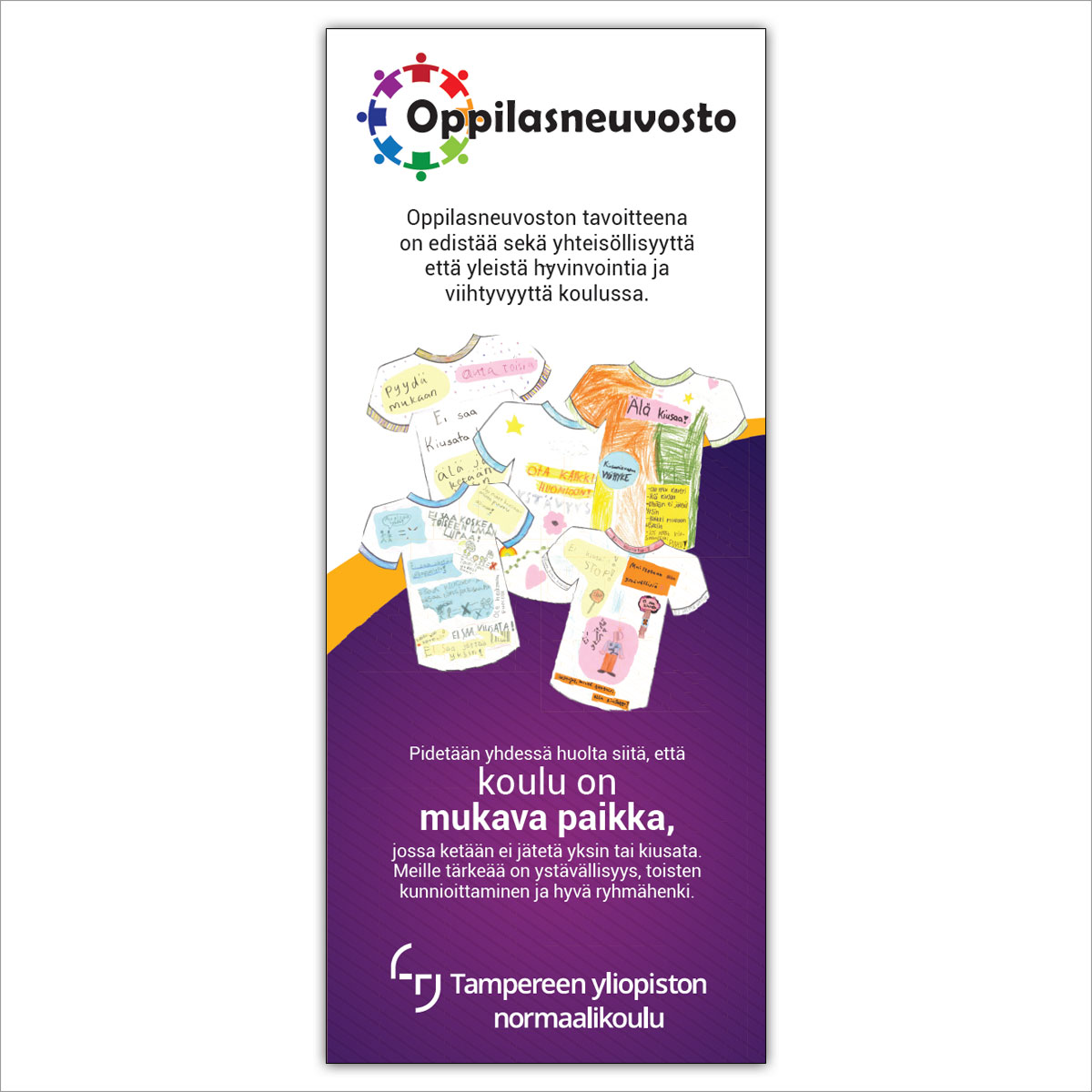 Tampereen yliopiston normaalikoulun työtilan kohokirjankyltti ja teippaukset